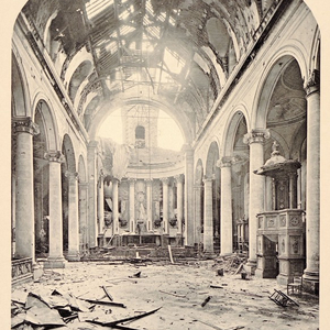 Dans sa masse trapue, la vieille tour semble défier les obus ; mais le sanctuaire, la tribune et une muraille latérale présentent d’énormes brèches ; la sacristie est couverte de décombres. Le cimetière est comme hérissé de croix toutes neuves qui ressemblent à des épées plantées en terre.