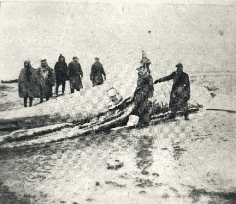Baleine échouée sur la côte (Étaples, le Touquet?) durant la première guerre mondiale, [1914-1918]. Archives départementales du Pas-de-Calais, 37 Fi 399.