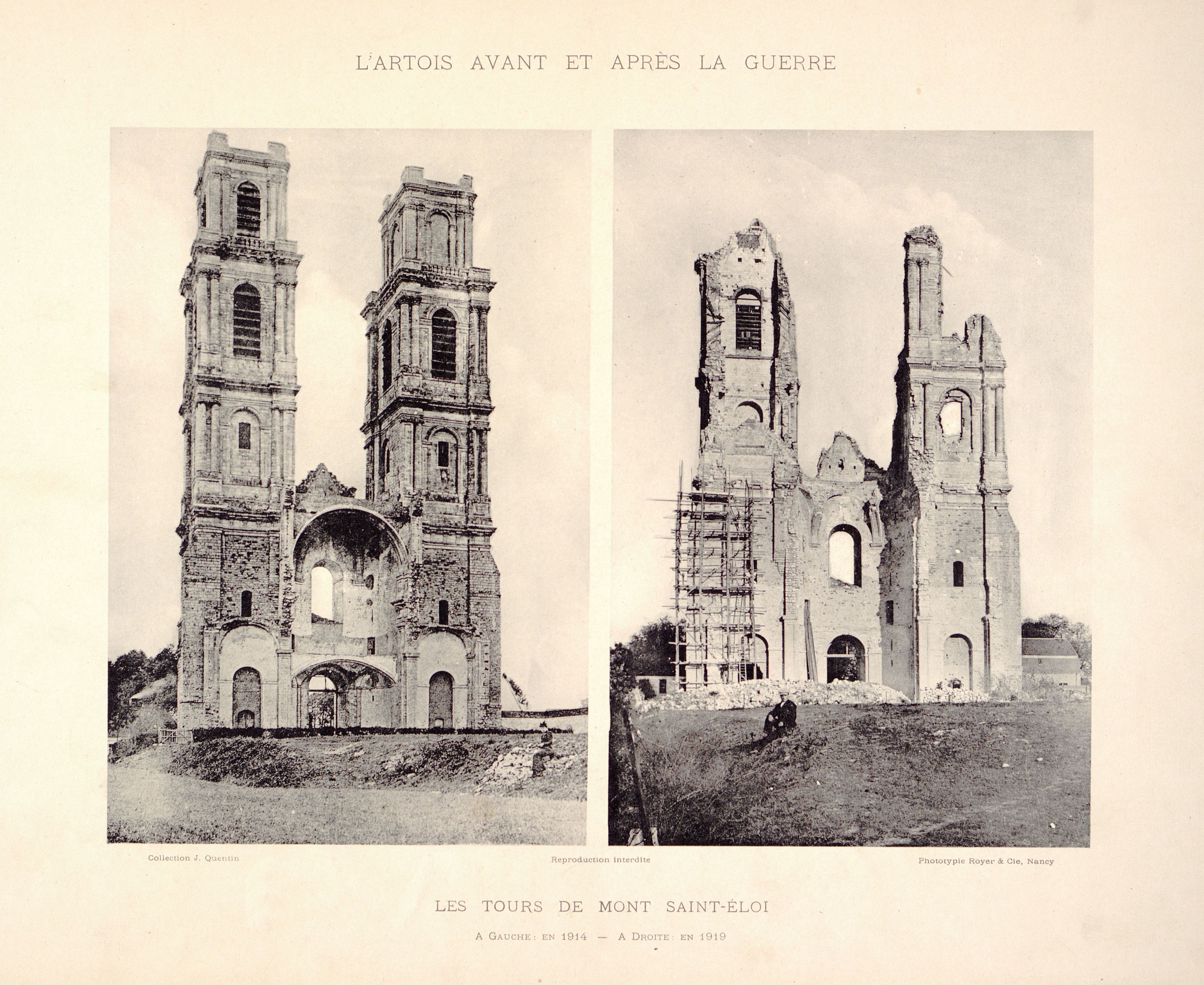 Qu’il nous suffise de savoir que, comme Paris, nos tours de Mont-Saint-Éloi sont restées debout. – Endommagées, il est vrai, mais toujours défiantes. Elles sont là, semblant jeter à la face de l’ennemi, terré un peu plus loin, le défi du célèbre Français de jadis qui, dans un moment des plus critiques s’écriait : "J’y suis, j’y reste !..."
