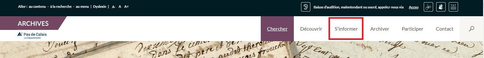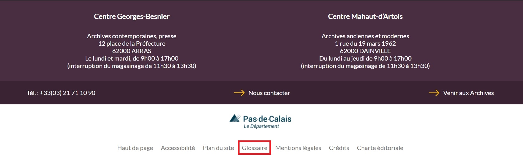 Il existe un glossaire d’archivistique présent dans le site https://archivespasdecalais.fr/Glossaire et accessible depuis le pied de page présent sur l’ensemble des pages du site.