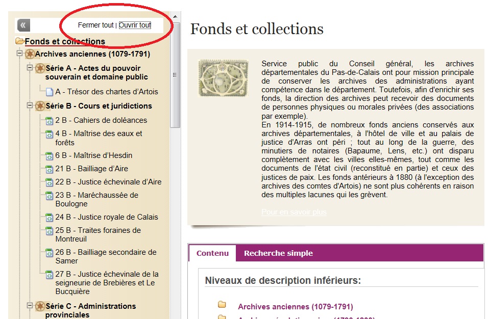 Les inventaires sont rattachés au cadre de classement réglementaire. Il est ici présenté sous forme arborescente ; en le dépliant, vous accédez aux instruments de recherche (pour cela, cliquez sur les petits plus à gauche des énoncés ou sur l'intitulé).