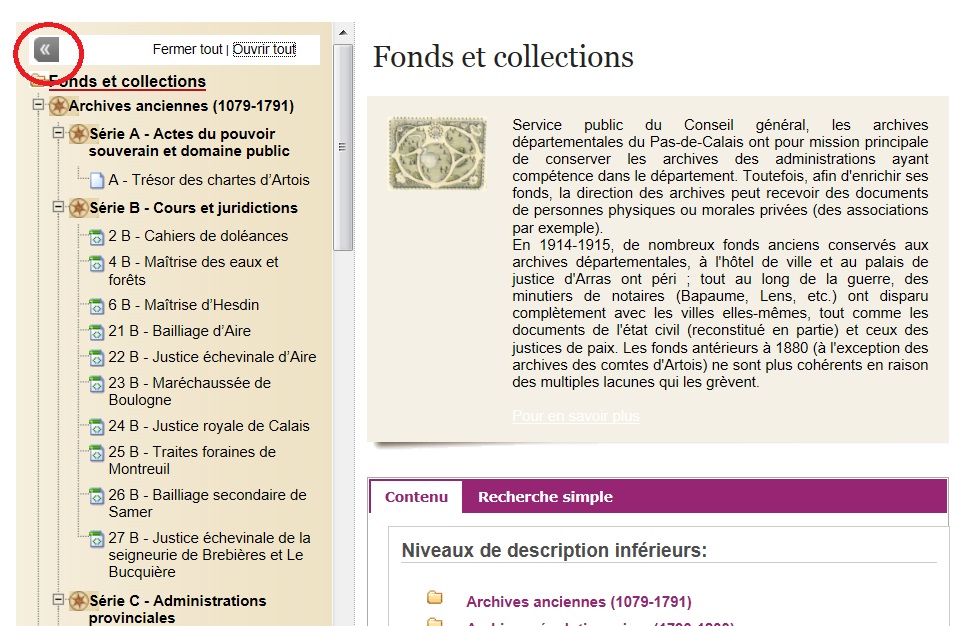 Ces derniers se présentent sous la même forme que l'interface Inventaires en ligne : une arborescence dans la colonne de gauche, et le contenu détaillé dans le bloc central.