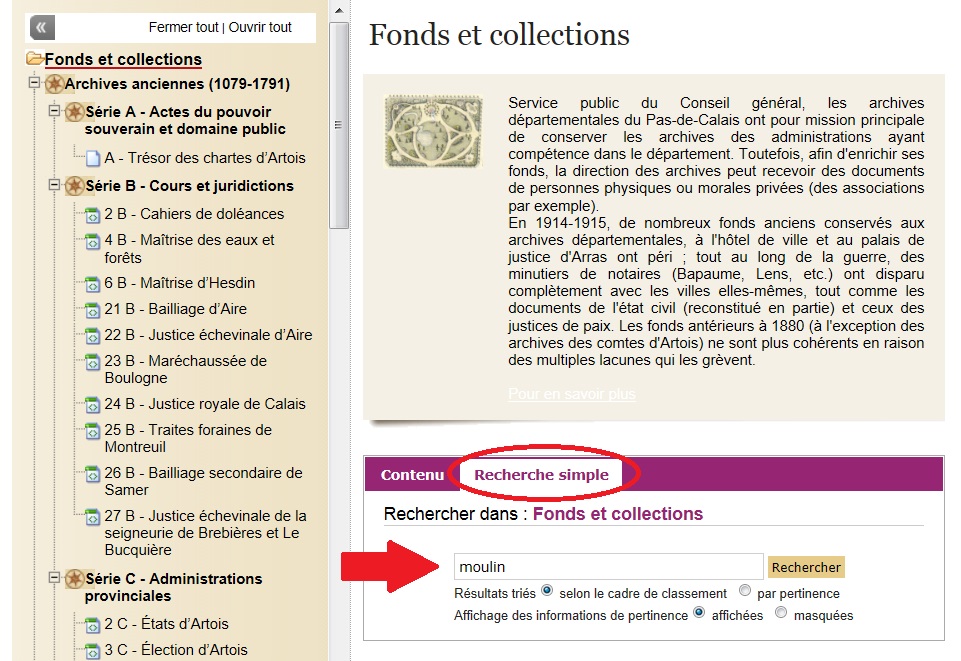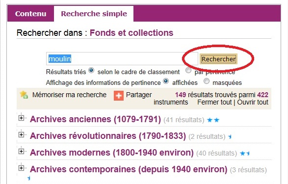 Pour effectuer une recherche dans tous les inventaires en entrant un mot-clé, cliquez dans la partie centrale sur Recherche simple et entrez votre mot-clé dans la case prévue à cet effet.