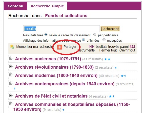 Pour restreindre la recherche à une série (par exemple dans Archives privées), cliquez sur l'intitulé dans le cadre de classement à gauche.