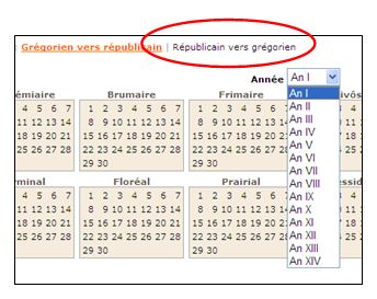 Pour convertir une date du calendrier républicain (par exemple le 5 nivôse de l’an III), cliquez sur Républicain vers grégorien et effectuez les mêmes tâches que ci-dessus.