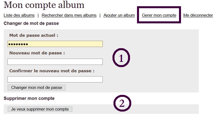 Lorsque vous êtes connecté à votre compte Albums, vous pourrez dans l'onglet "Gérer mon compte" :