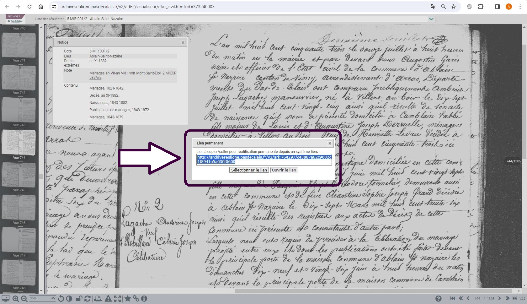 La fonctionnalité « permalien » est intégrée au visualiseur des archives numérisées du Pas-de-Calais. Ces liens persistants, que vous pouvez créer pour chaque image, permettent d'accéder en un clic à l'image correspondante dans son contexte.