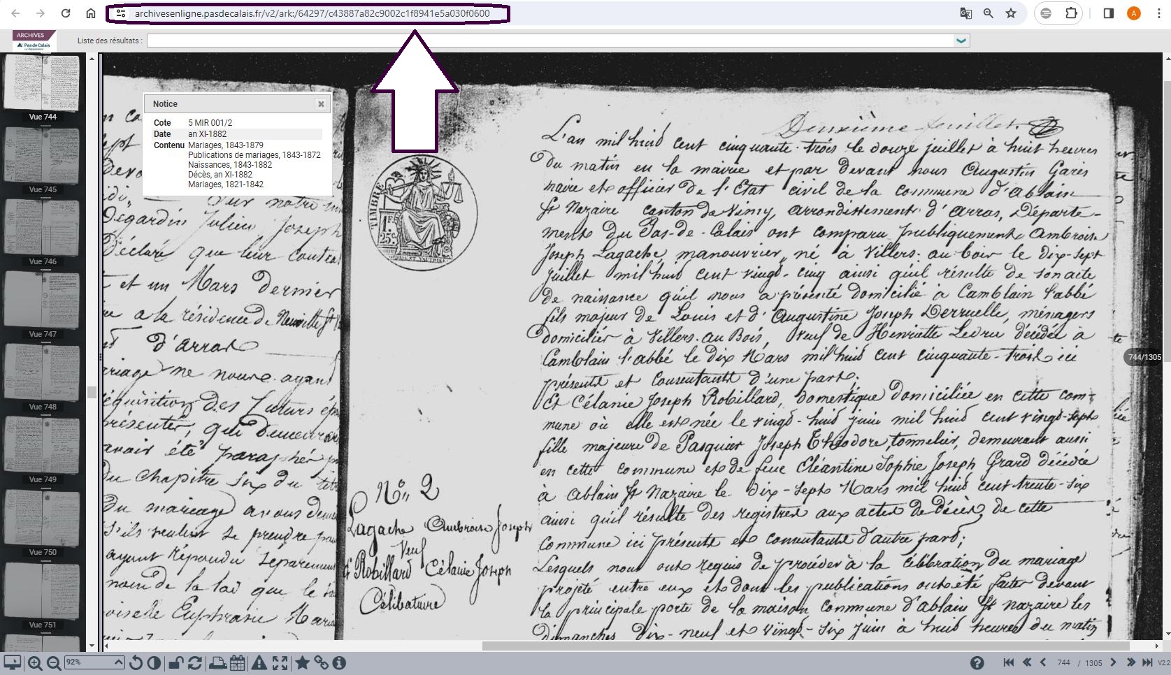 Utiliser le lien ark ainsi enregistré permet de retourner directement dans le visualiseur des archives du Pas-de-Calais sur l'image précise à laquelle il renvoie, affichée dans son contexte.