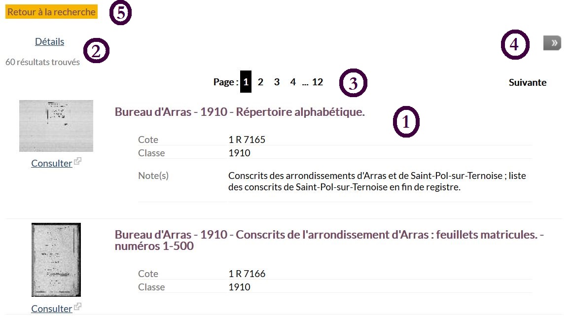 Si votre recherche retourne plus de 5 résultats en affichage "Détail" ou 25 résultats en affichage "Liste", une pagination des résultats est mise en place. Vous pouvez cliquer sur "Page suivante", "Page précédente" ou directement sur les numéros de page pour consulter l'ensemble des résultats.