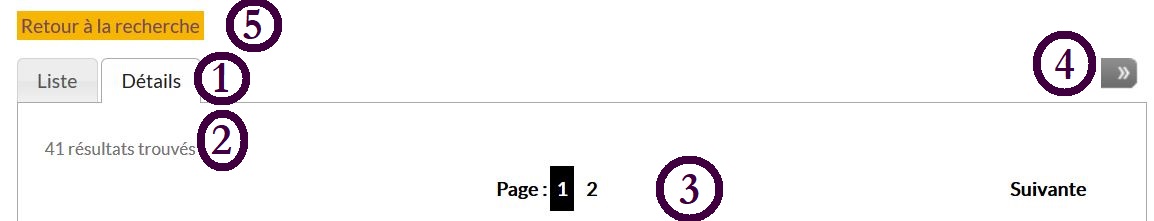 Si votre recherche retourne plus de 35 résultats en affichage "Liste" ou 10 résultats en affichage "Détail", une pagination des résultats est mise en place. Vous pouvez cliquer sur "Page suivante", "Page précédente" ou directement sur les numéros de page pour consulter l'ensemble des résultats.