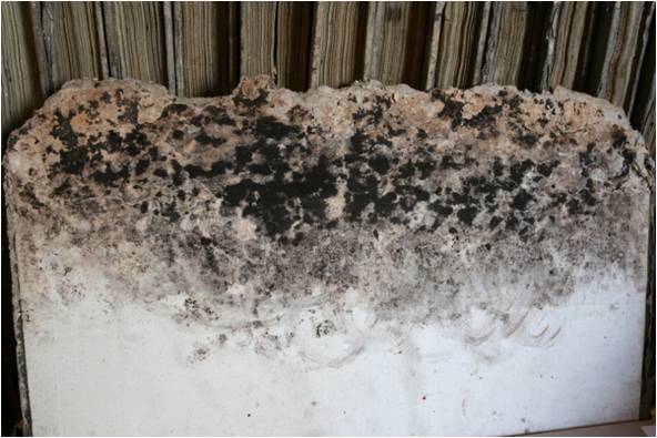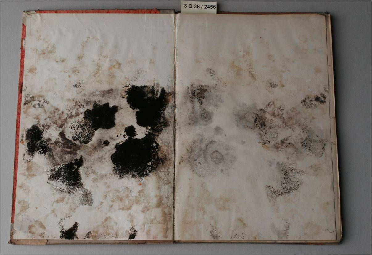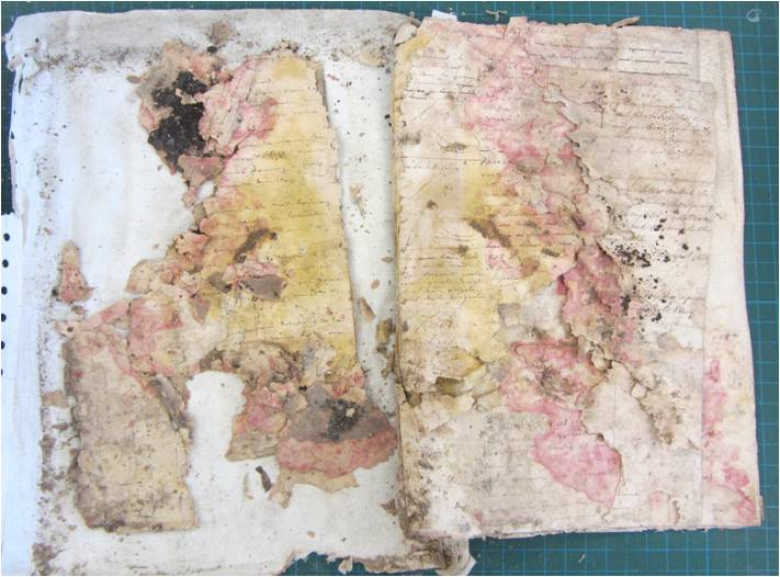 Exemples de documents attaqués par les moisissures arrivés aux archives départementales :