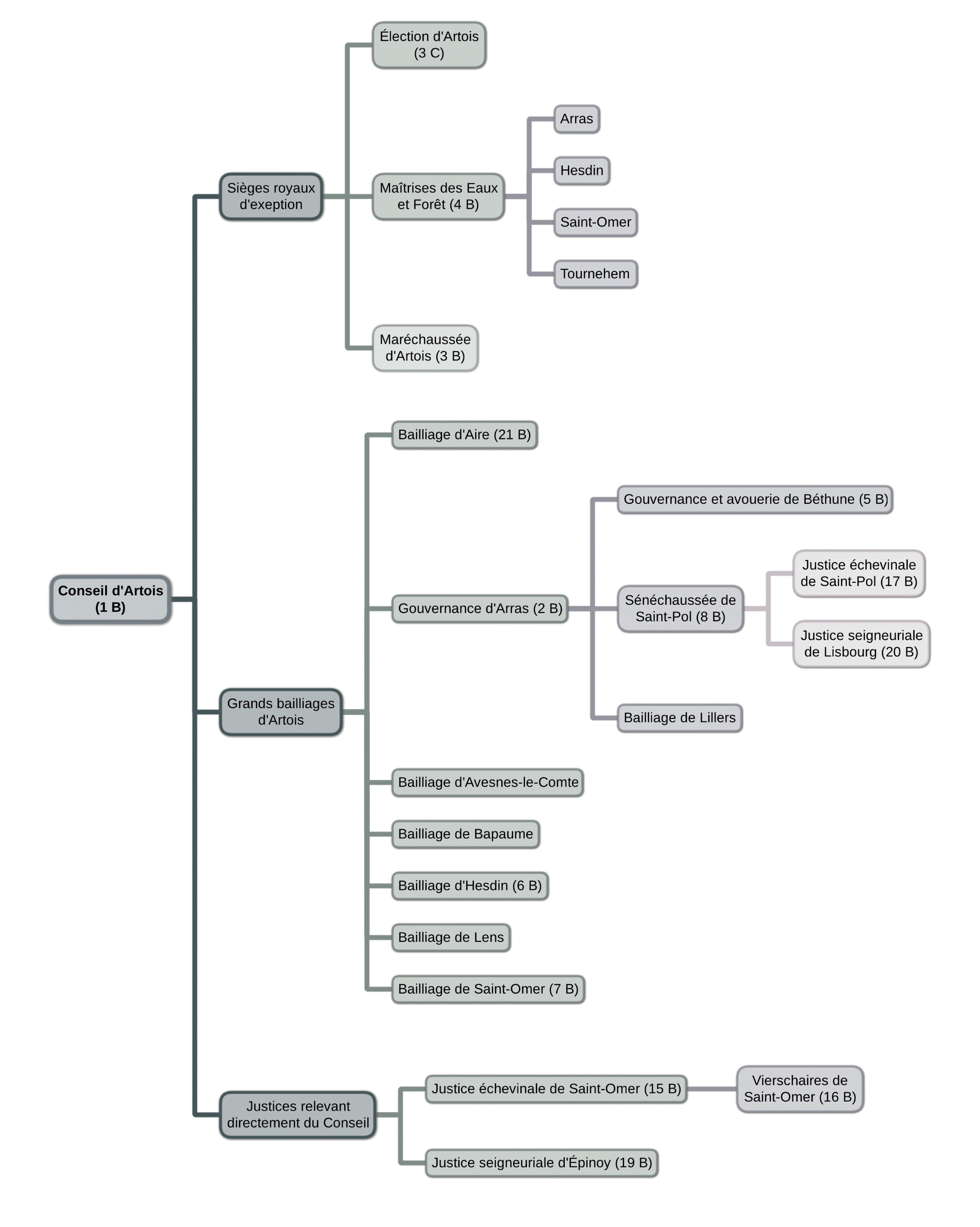 Les épaves du fonds du Conseil d’Artois sont conservées dans la sous-série 1 B. La thèse de doctorat de Philippe Sueur, Le conseil provincial d’Artois (1640-1790). Une cour provinciale à la recherche de sa souveraineté, publiée dans les Mémoires de la Commission départementale des monuments historiques du Pas-de-Calais (cote BHC 2226/1-2) est indispensable pour qui veut comprendre cette institution atypique.