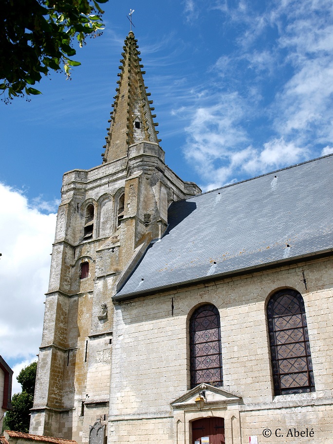 La tour de l’église est coiffée d’une flèche en pierre à crochets qui fut victime plusieurs fois de la foudre, en 1926, 1972 et 1989. Le clocher est classé aux Monuments Historiques en 1927 pour permettre une restauration identique et respectueuse de sa structure originelle.