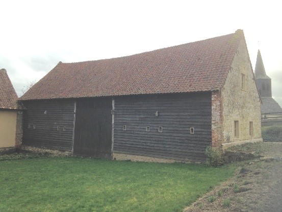 Ces deux bâtiments présentent une façade caractéristique de l’architecture en torchis. De type allongée, les façades sont plutôt basses et comprennent un seul niveau. La toiture, pentue à deux versants, est recouverte de pannes flamandes. Pour la couverture, démunie de gouttière, c’est le coyau en débord qui protège la structure du ruissellement de l’eau. A l’origine, cette bâtisse agricole était dépourvue d’ouverture. Seules de petites baies de ventilation jalonnaient la façade et permettaient d’identifier la destinée du bâtiment. L’un des enjeux de la restauration était de faire en sorte que les baies, nouvellement créées, s’insèrent harmonieusement à cette grange en torchis. Ainsi, une double fenêtre prend appui sur un poteau cornier tandis que d’autres fenêtres, de formes rectangulaires, sont plus hautes que larges. La porte rectangulaire est large et ajourée. Les tenons passants des solives sont perceptibles dans les murs, ils permettent de relier les murs de façade entre eux et de garantir la solidité du bâti.