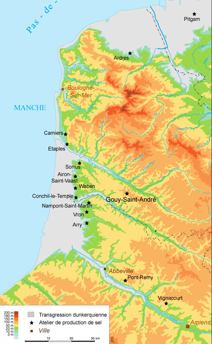 Elle est bien connue à la période gauloise (entre moins 450 ans et moins 52 ans) sur le littoral français et en particulier sur les côtes de La Manche. La particularité du site de Gouy est sa position éloignée de la matière première principale qui est l’eau salée. Comment les hommes procédaient-ils alors ? La réponse est sans doute à chercher au croisement des données archéologiques et géographiques.