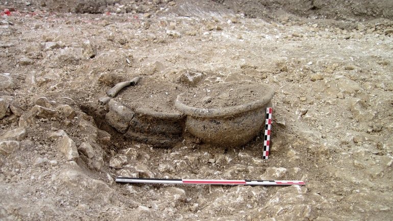 Creusée directement dans l’affleurement crayeux, l’une des sépultures se composait d’un amas osseux et de ces deux céramiques. Cliché : CD62/DA