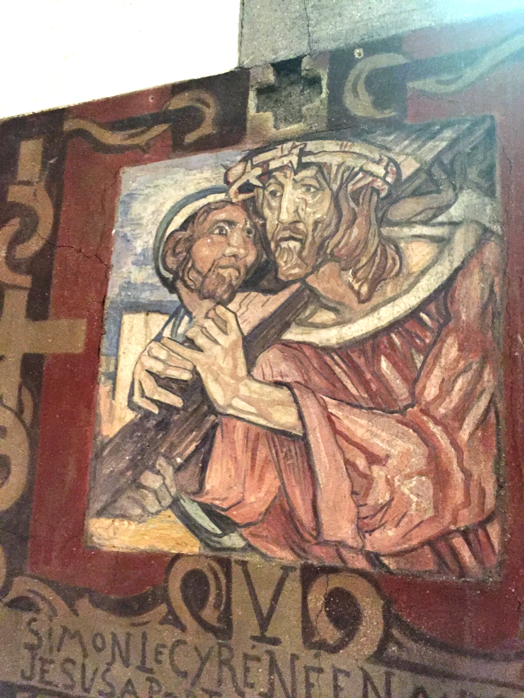 Les décors ont été identifiés lors d’une étude préalable à la restauration des 14 stations du chemin de croix par Virginie TROTIGNON AUBERT, restauratrice de peintures et Xavier BEUGNOT, restaurateur de peintures. Le chemin de croix, dissimulé par des panneaux occultant, ont été redécouverts lors des travaux de 2010-2011. Le rideau occultant le Saint-Louis est enlevé, rendant la peinture visible. Un projet de restauration de l’ensemble des fresques est à l’étude.