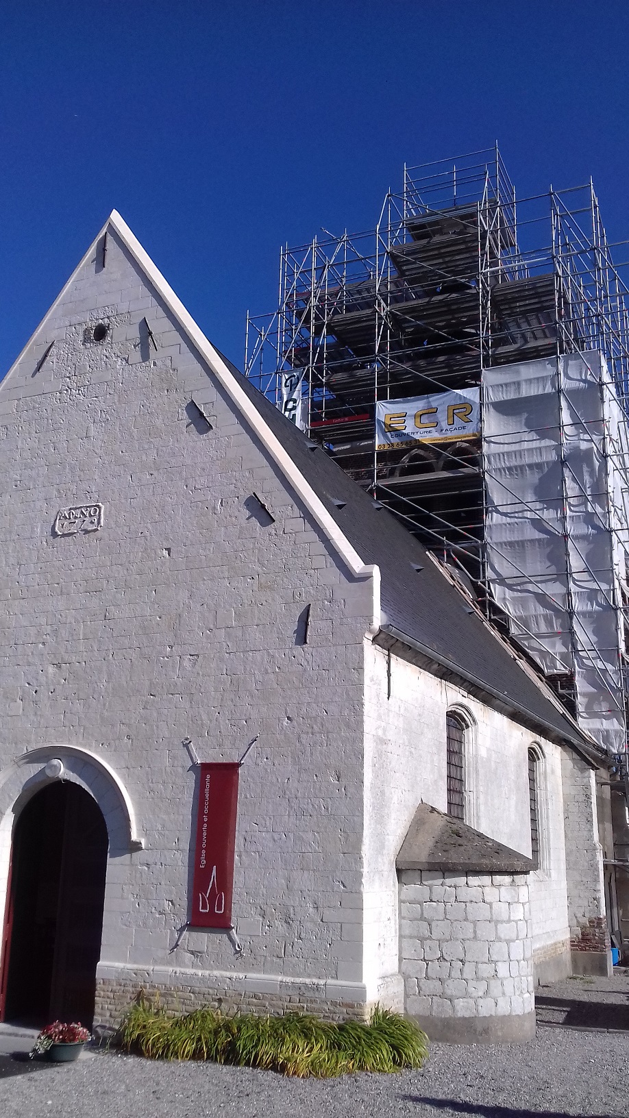 La priorité est donc donnée à la restauration du clocher et de la façade occidentale pour une mise en sécurité de l’édifice et ainsi des fidèles. Deux tranches de travaux sont alors prévues. La première tranche est réalisée en 2018 pour restaurer la couverture, la charpente de la flèche du clocher et les maçonneries en brique de la tour. Le pignon de la façade occidentale de l’édifice est réalisé en même temps. Son coût s’est élevé à 237 861,46 € HT. La seconde tranche, en attente d’être réalisée, concerne la nef, le chœur et la sacristie et son montant est estimé à 172 179,37€ HT.