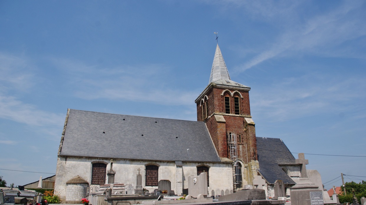 L’église est le résultat de plusieurs phases de construction et de restauration à partir d’un soubassement daté du 12ième siècle. L’ensemble est ainsi complété au 19ième siècle par une tour-clocher centrale en brique rouge. Le beffroi abrite une cloche datée de 1506 et fondue par Colard du Breucq. Elle est classée au titre des Monuments Historiques par arrêté du 20 septembre 1943. Henry Delpierre, moine de l’abbaye de Wisques en charge de la paroisse à partir de cette même année fait aménager cette église après la Seconde Guerre mondiale.