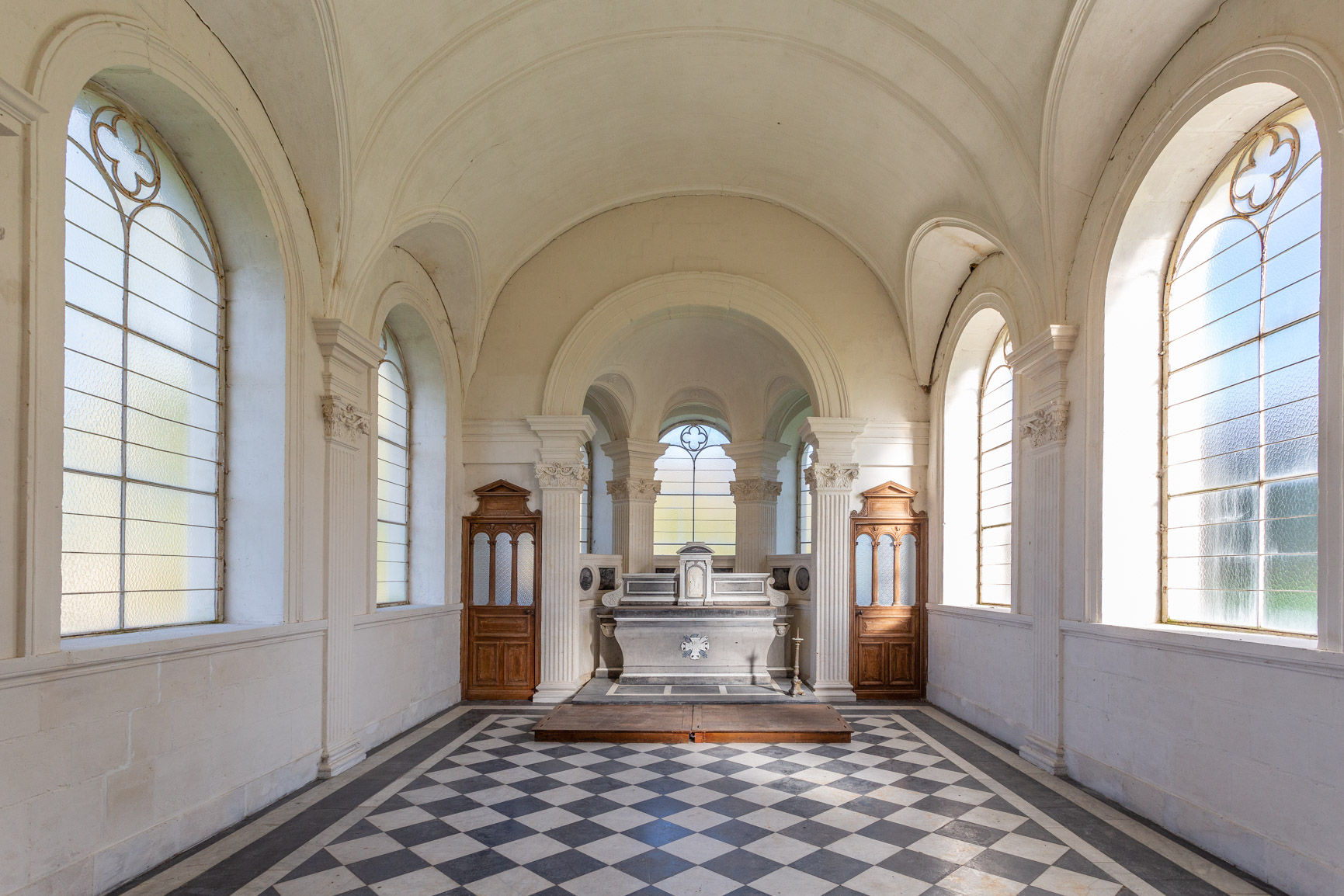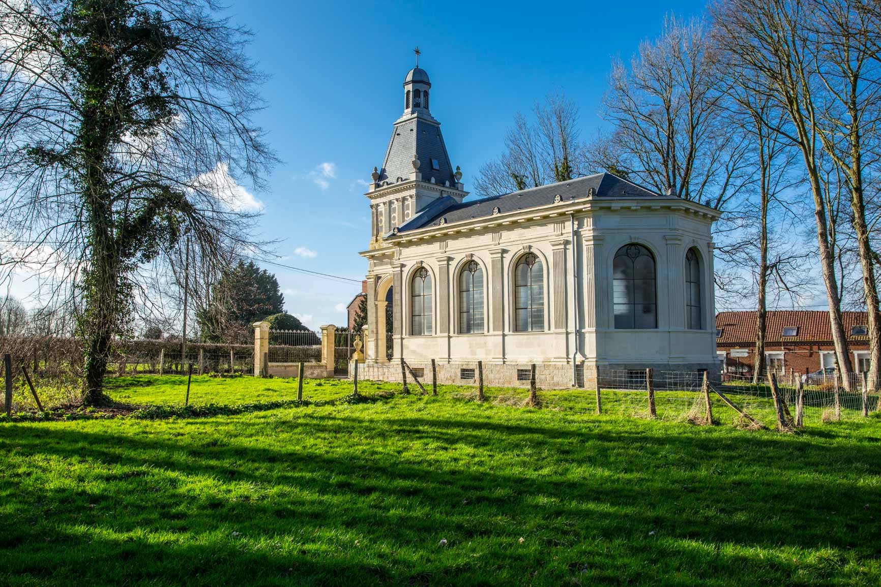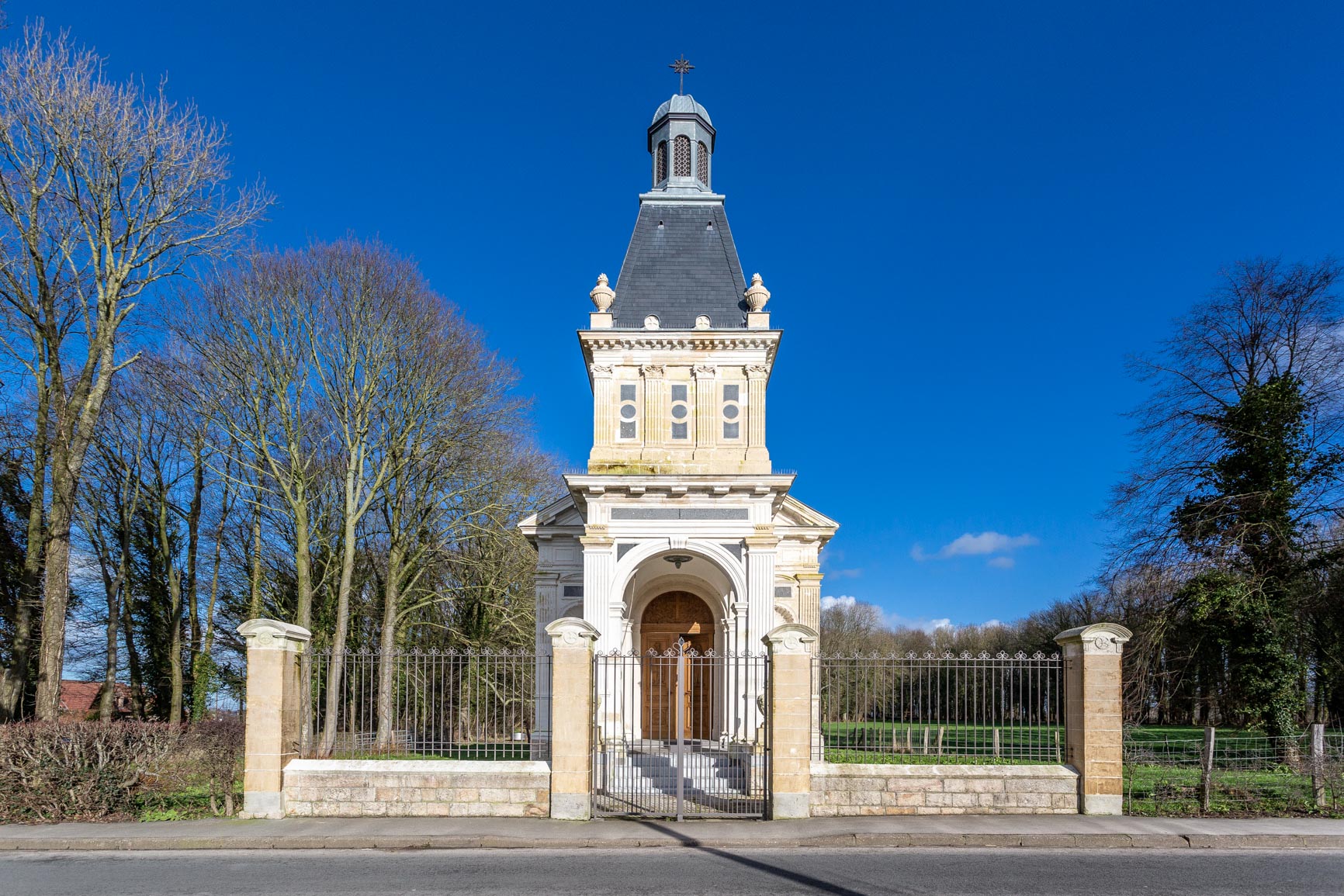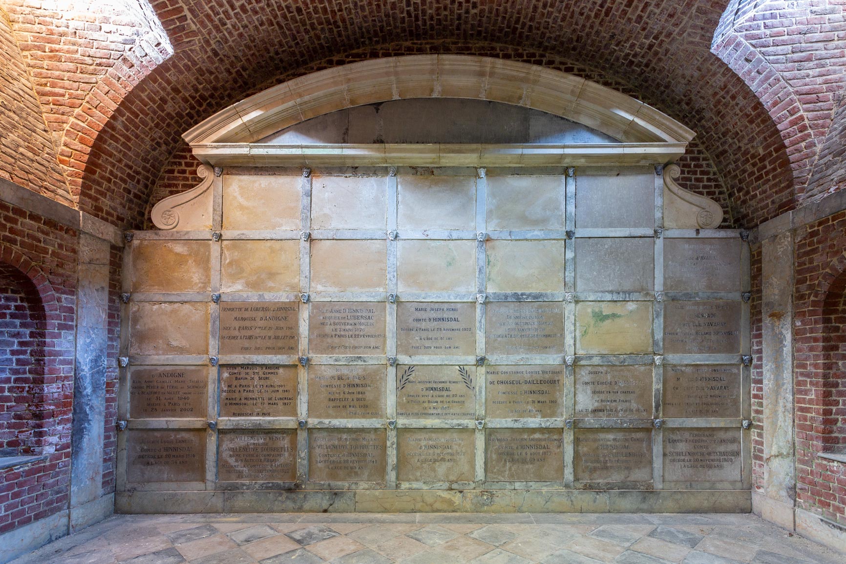 C’est leur fille Roseline qui fait ériger pour ses parents et aïeux la chapelle Sainte-Mélanie, après la mort de sa mère en 1848. L’édifice affirme le goût familial pour la Renaissance italienne et fait référence au projet souhaité par le Comte Joachim d’Hinnisdael par la conception d’une crypte funéraire accessible à partir du chœur voûté. En 1914-1918, le château est réquisitionné par l’Etat-major anglais. Abandonné par la famille, il est de nouveau investi pas les troupes anglaises en 1939 puis par les allemands en 1940. Les aviateurs anglais bombarde le site en 1944 et détruisent entièrement le château, seules la chapelle Sainte-Mélanie et la ferme sont préservées et sont depuis 2013 propriétés communales.